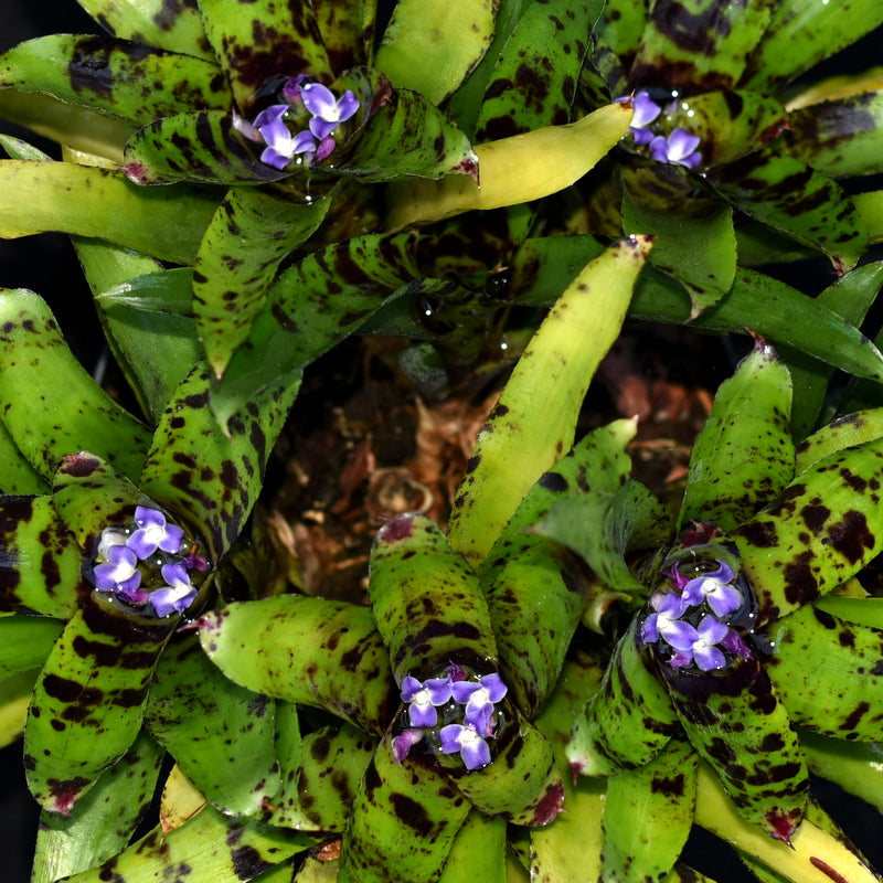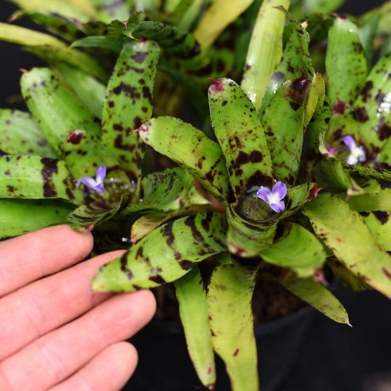 Neoregelia 'Java Plum' x 'Babe' is a beautiful mini or small growing Neoregelia. It has mid to dark green leaves with big splotches of dark purple. It has nice lilac flowers. A perfect little pot plant, ideal for terrariums also.